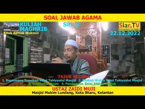 Video Kuliah Maghrib dari kitab Akhlak Mukmin di Masjid Mukim Lundang, Kota Bharu, Kelantan pada 22.12.2022. Tajuk Bicara dalam video ini ialah: (1) Bagaimana Tunaikan Solat Tahiyyatul Masjid (2) Bilakah Waktu Solat Tahiyyatul Masjid (3) Takbiratul Ihram (4) Pembukaan Solat Adalah Wuduk. Disampaikan oleh Ustaz Zaidi Muji.