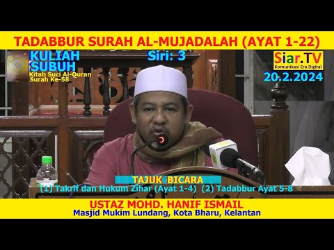 Video Kuliah Subuh dari Kitab Suci Al-Quran (Surah Ke-58) di Masjid Mukim Lundang, Kota Bharu, Kelantan pada 20.2.2024. Tajuk Bicara dalam video ini ialah: "(1) Takrif dan Hukum Zihar (Ayat 1-4), (2) Tadabbur Ayat 5-8". Disampaikan oleh Ustaz Mohd. Hanif Ismail.