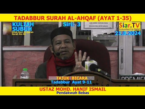 Video Kuliah Subuh dari Kitab Suci Al-Quran (Surah Ke-46) di Masjid Mukim Lundang, Kota Bharu, Kelantan pada 21.8.2024. Tajuk Bicara: "Tadabbur Ayat 9-11". Disampaikan oleh Ustaz Mohd. Hanif Ismail.