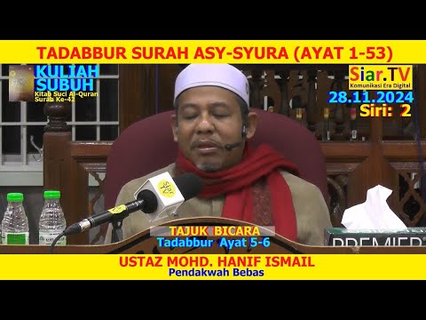 Video Kuliah Subuh dari Kitab Suci Al-Quran (Surah Ke-42) di Masjid Mukim Lundang, Kota Bharu, Kelantan pada 28.11.2024. Tajuk Bicara: "Tadabbur Ayat 5-6". Disampaikan oleh Ustaz Mohd. Hanif Ismail.