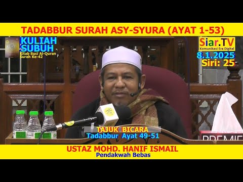 Video Kuliah Subuh dari Kitab Suci Al-Quran (Surah Ke-42) di Masjid Mukim Lundang, Kota Bharu, Kelantan pada 8.1.2025. Tajuk Bicara: “Tadabbur Ayat 49-51”. Disampaikan oleh Ustaz Mohd. Hanif Ismail.